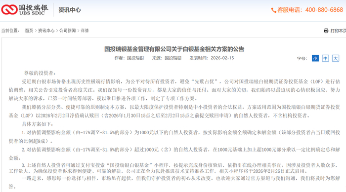 国投瑞银遵循分层分类、便捷可靠的原则制定专项工作方案,以最大限度保护投资者特别是中小投资者的合法权益。方案适用范围为国投瑞银白银期货证券投资基金(LOF)以2026年2月2日净值确认赎回(含2026年1月30日15点之后至2月2日15点之前提交赎回申请)的自然人投资者,不含机构投资者。